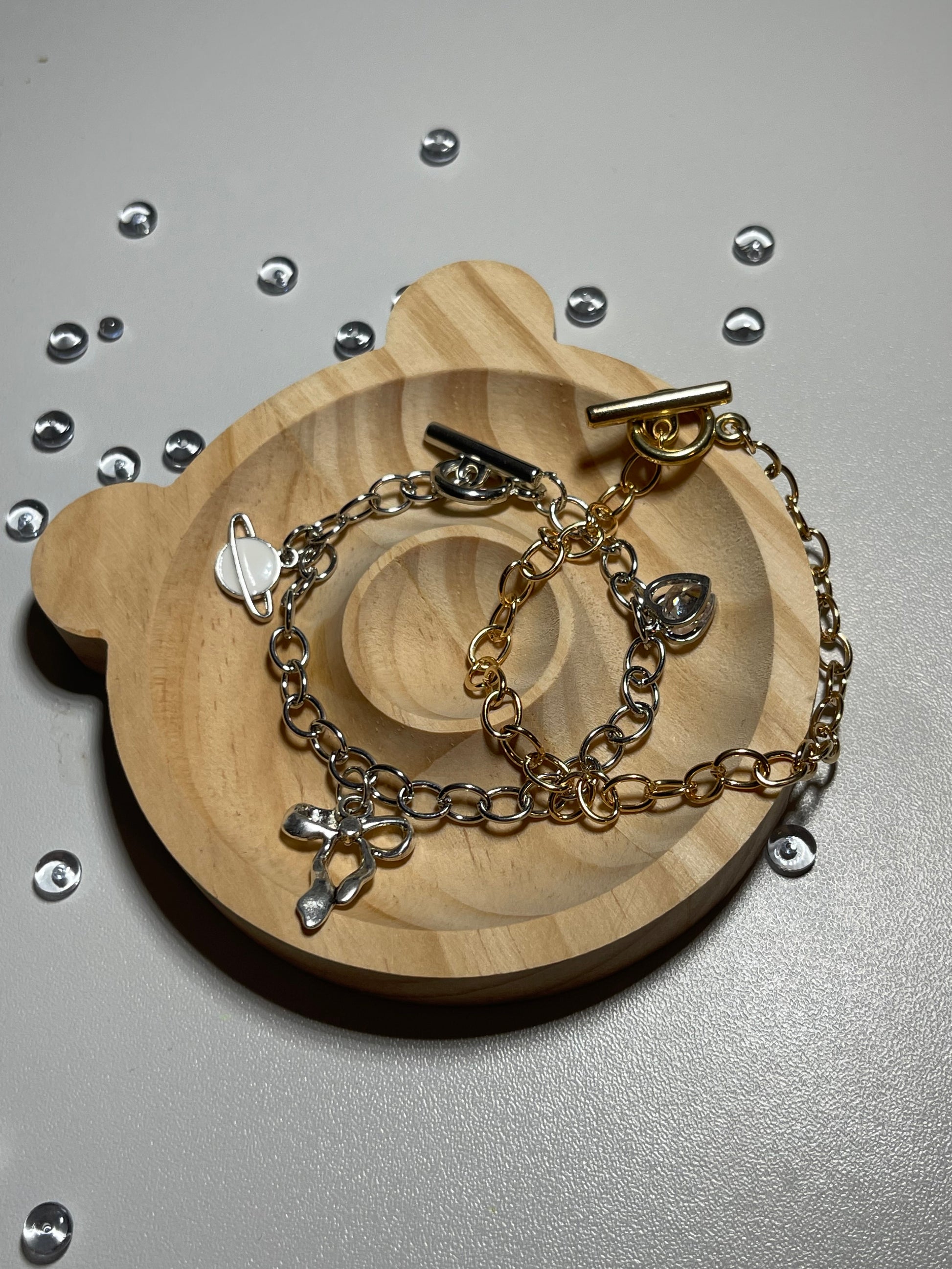 Dieses charmante Armband-Set kombiniert goldene und silberne Gliederketten mit liebevoll gestalteten Anhängern – darunter Ballettschuhe, ein Planet und ein Tropfen. Die verspielte Symbolik macht es zu einem einzigartigen Accessoire mit Charakter. Ideal für alle, die das Besondere lieben und gerne Akzente setzen.