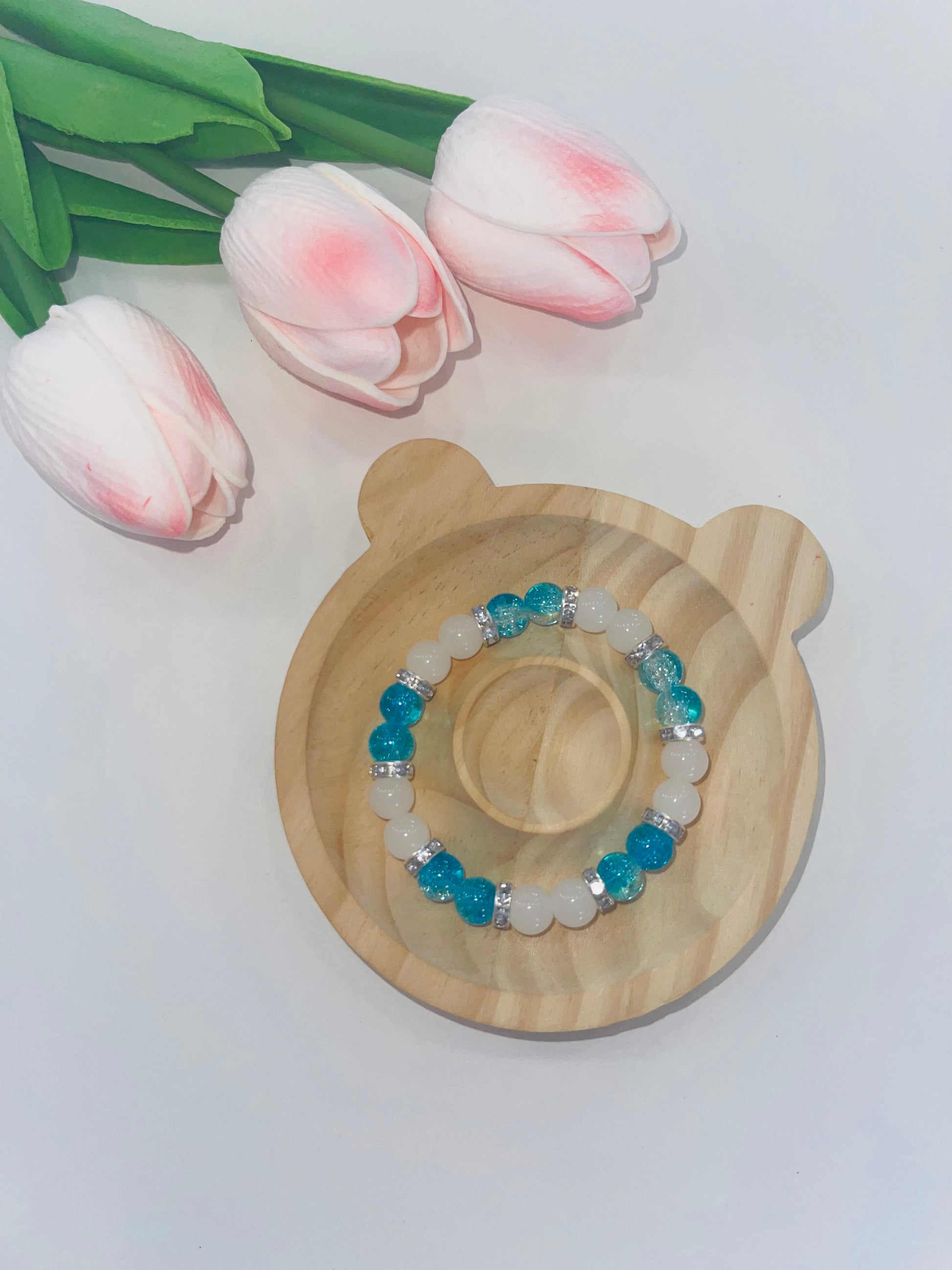 Dieses bezaubernde Armband kombiniert schlichte weiße Perlen mit funkelnden türkisfarbenen Crackle-Glasperlen und eleganten silbernen Zwischenelementen. Das Zusammenspiel der Farben erinnert an das leuchtende Meer und verleiht dem Armband eine frische, sommerliche Ausstrahlung. Ein elastisches Band sorgt für optimalen Tragekomfort – perfekt als stilvoller Hingucker im Alltag oder als Geschenk mit maritimem Flair.