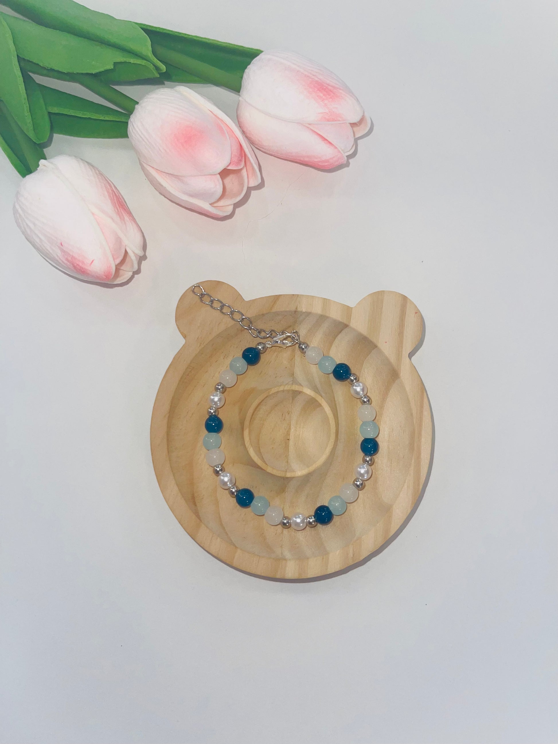 Inspiriert von der Frische des Meeres vereint dieses zarte Armband verschiedene Blau- und Weißtöne in harmonischem Zusammenspiel. Die hochwertigen Glas- oder Edelsteinperlen werden durch glänzende silberne Kugeln ergänzt und schaffen einen eleganten, modernen Look. Dank der verstellbaren Kette passt sich das Armband perfekt an jedes Handgelenk an – ideal für Alltag, Urlaub oder besondere Anlässe.