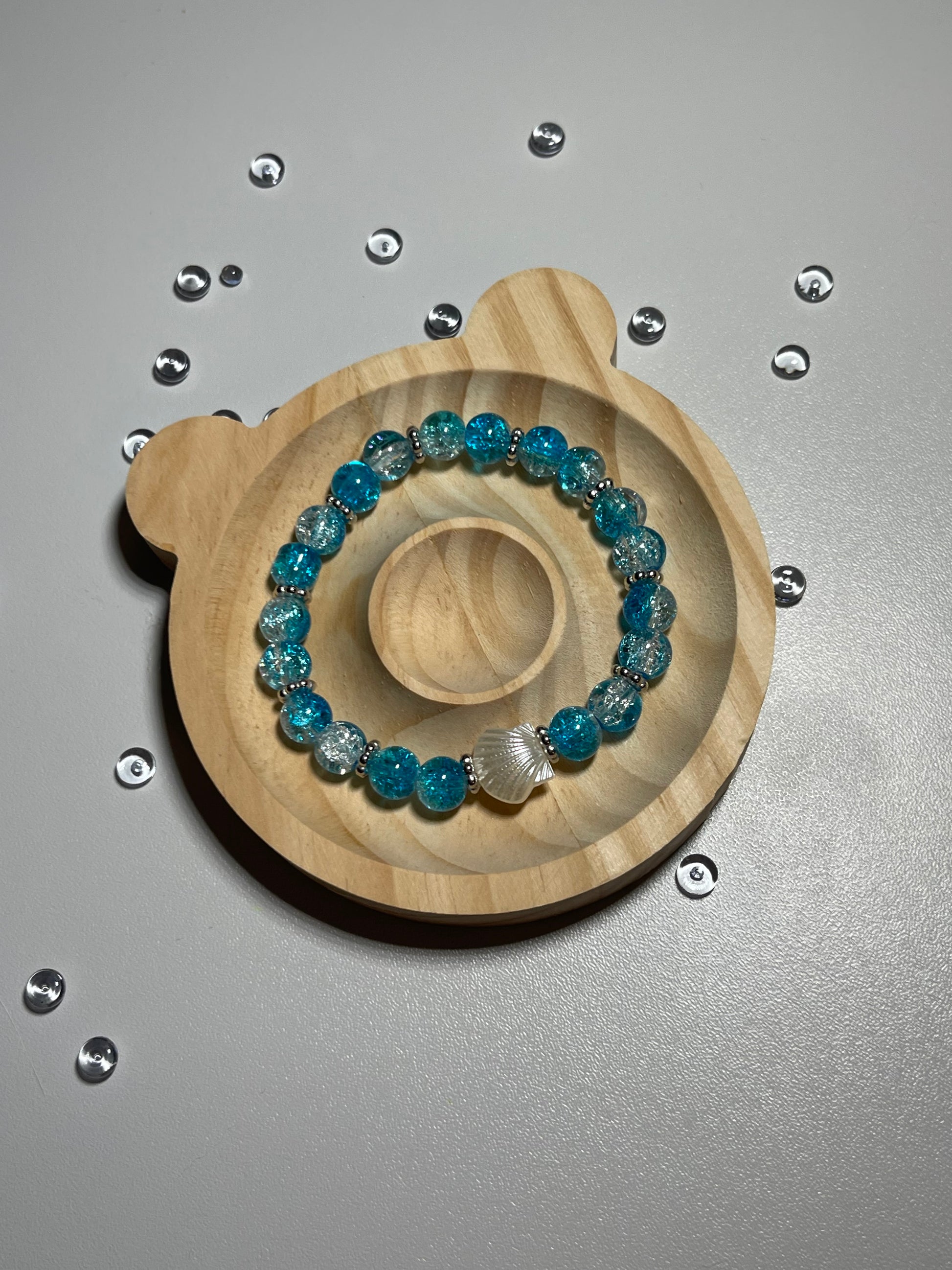 Dieses handgefertigte Glasperlen-Armband verzaubert mit einem harmonischen Farbspiel aus Türkis und Kristall. Die funkelnden Perlen erinnern an das Meer und machen das Armband zu einem besonderen Blickfang. Ein silberfarbener Muschel-Anhänger rundet das Design stilvoll ab – perfekt als sommerliches Accessoire oder liebevolles Geschenk.