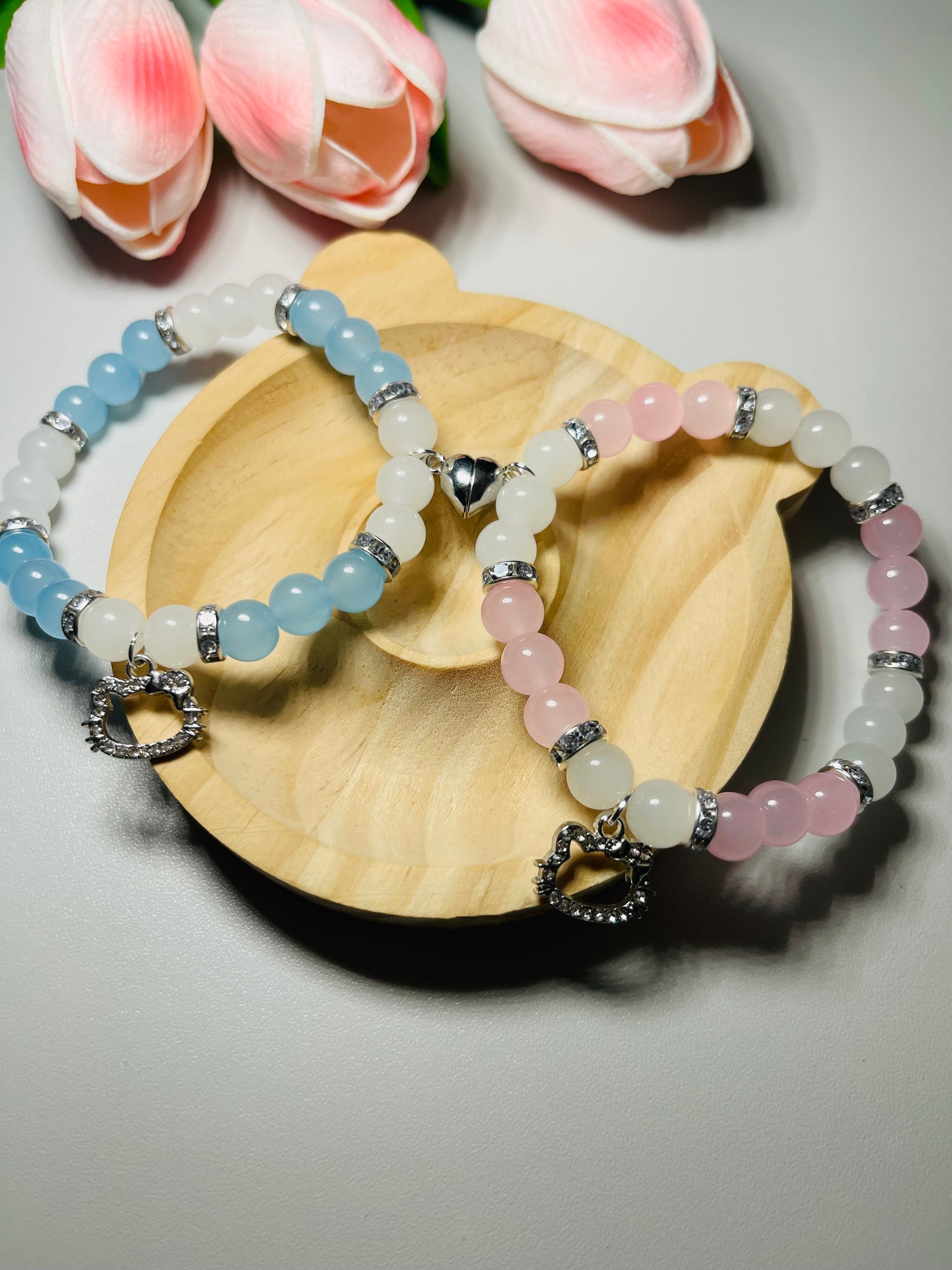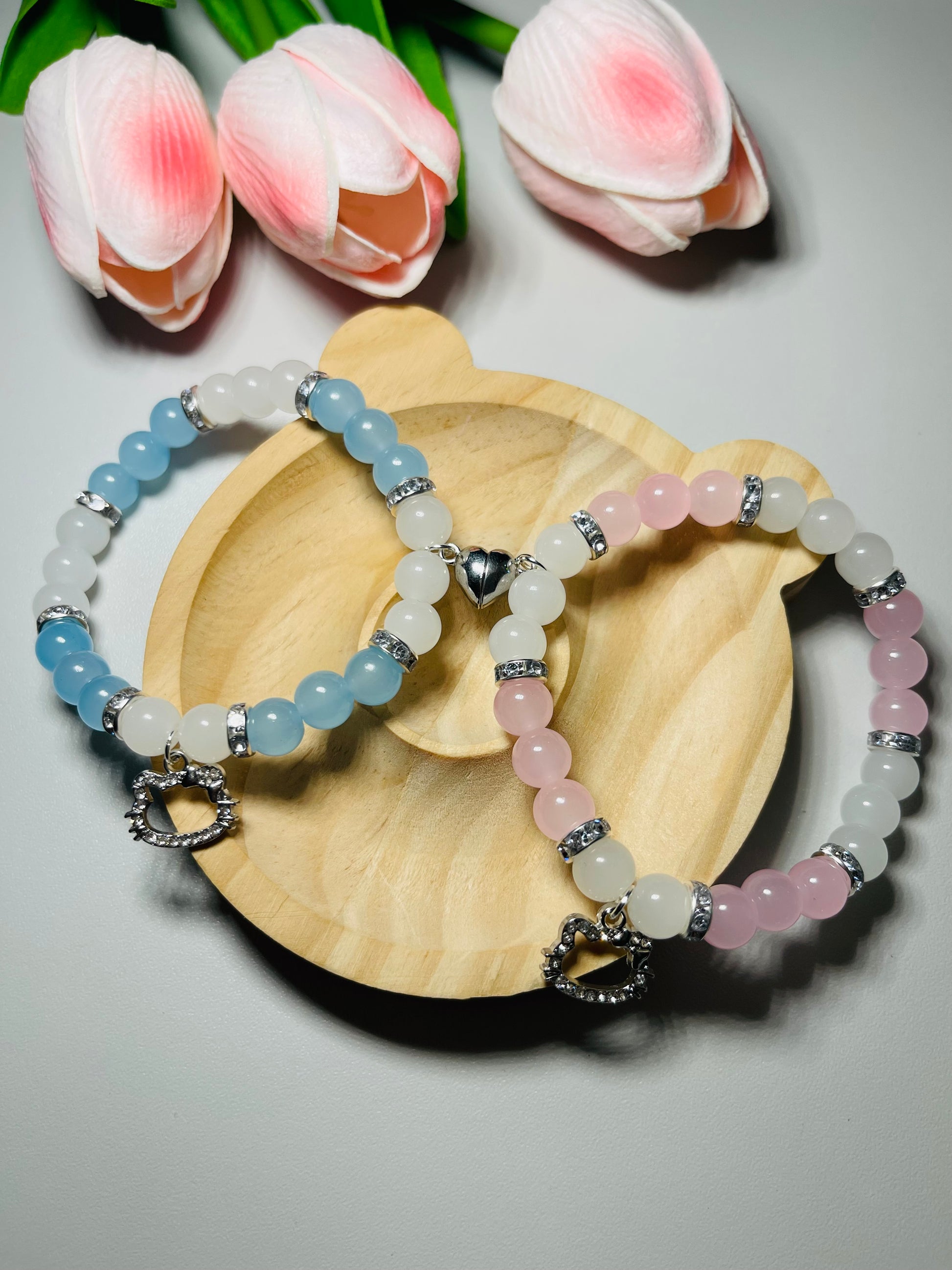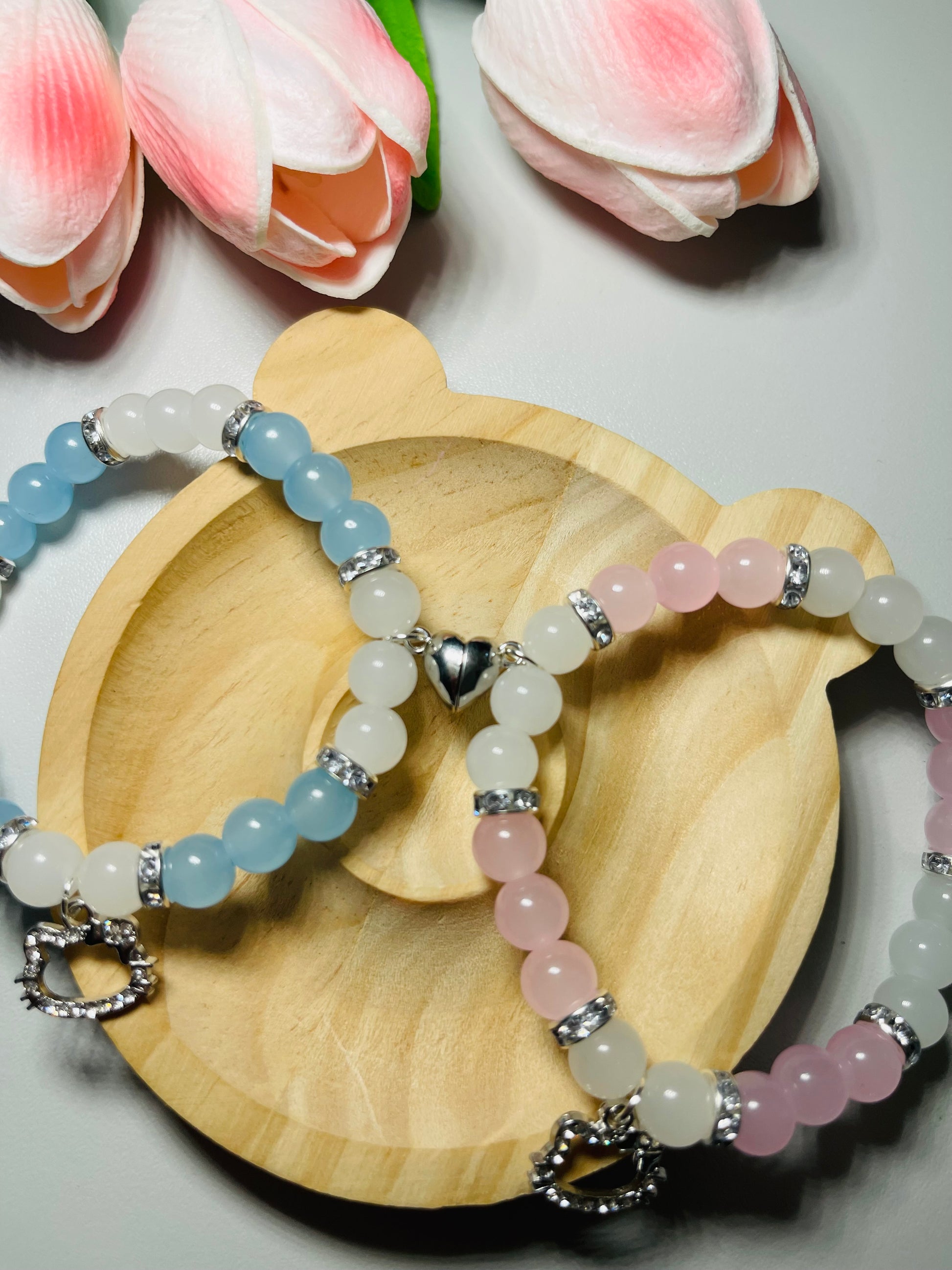 Diese zauberhaften BFF-Armbänder symbolisieren die tiefe Verbindung zwischen zwei besten Freundinnen. Jedes Armband ist mit hochwertigen Perlen in sanften Blau-, Rosa- und Weißtönen gefertigt und mit funkelnden Strass-Elementen verziert.