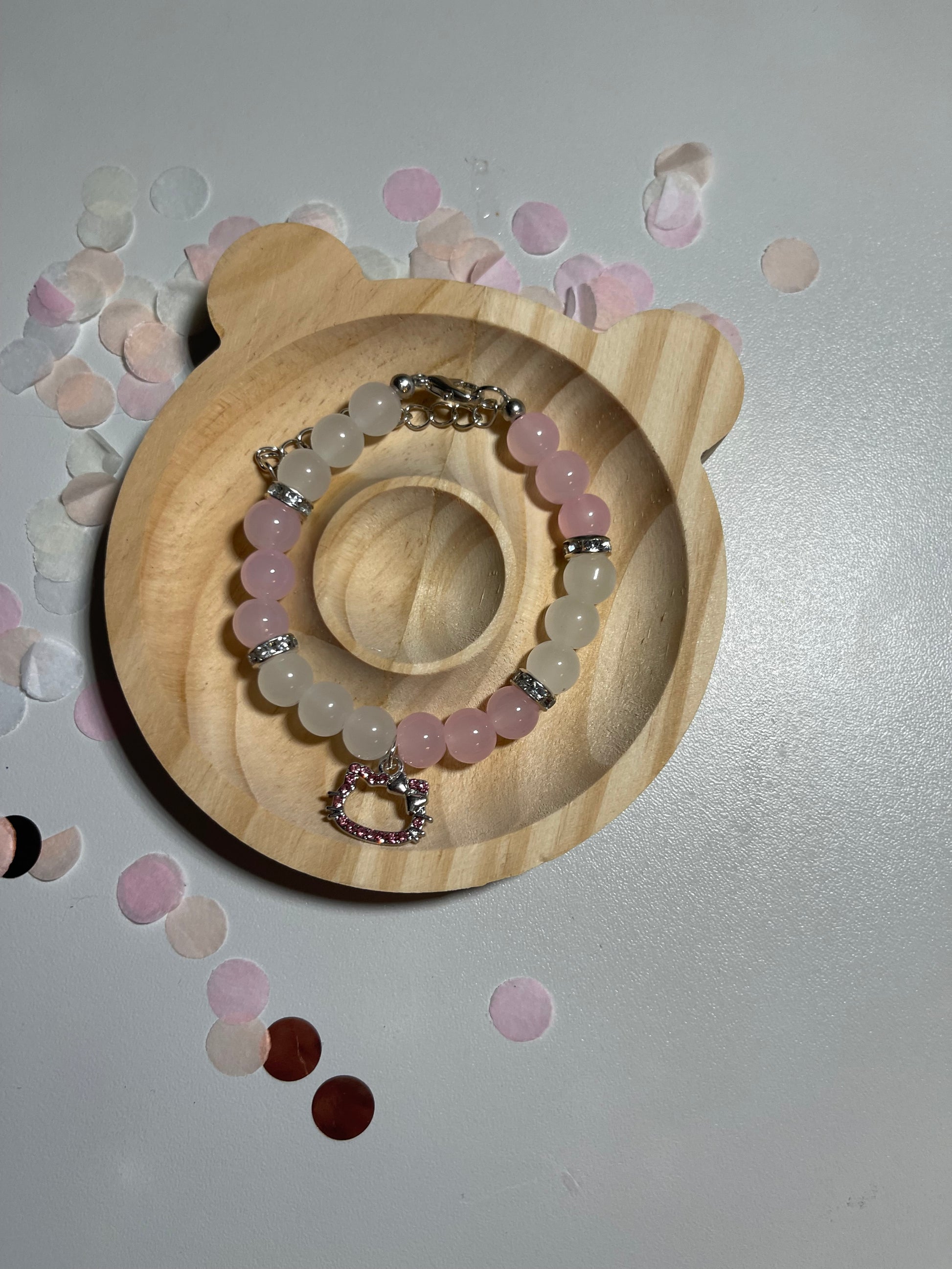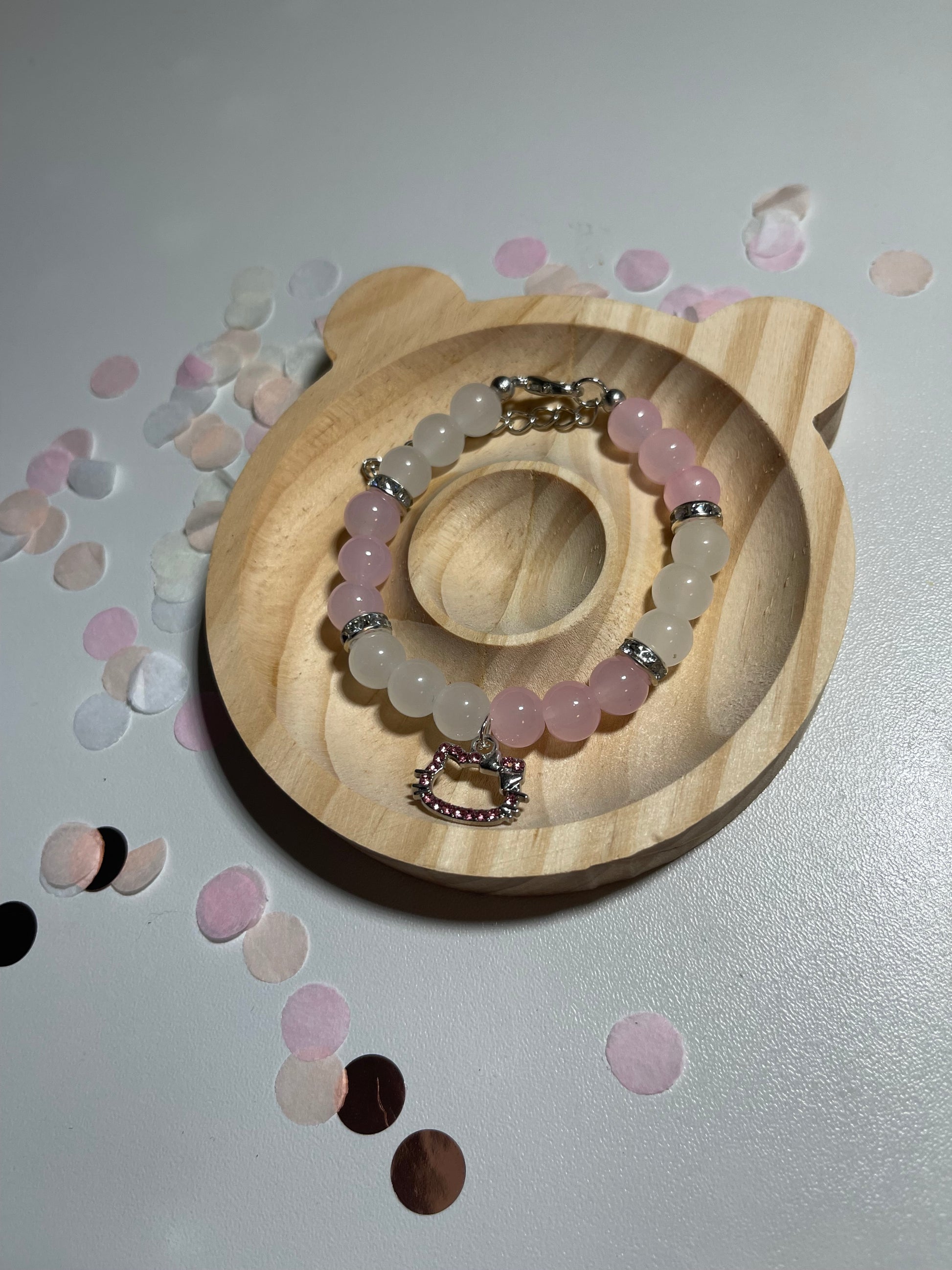 Arrangiert auf einem Bett aus pastellfarbenem Konfetti, strahlen die Armbänder eine jugendliche Leichtigkeit und romantische Note aus – perfekt für besondere Anlässe oder als liebevolles Geschenk für einen Herzensmenschen.