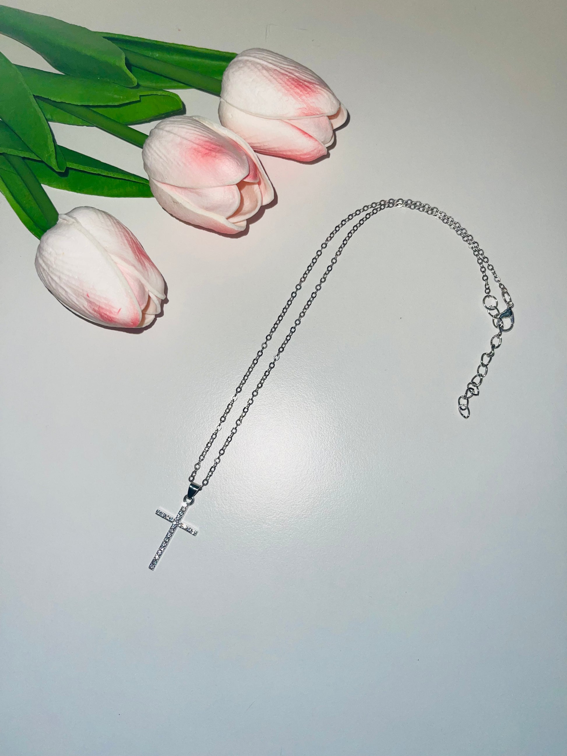 Diese zarte Silberkette mit einem mit funkelnden Steinen besetzten Kreuzanhänger vereint schlichte Eleganz mit spiritueller Bedeutung.