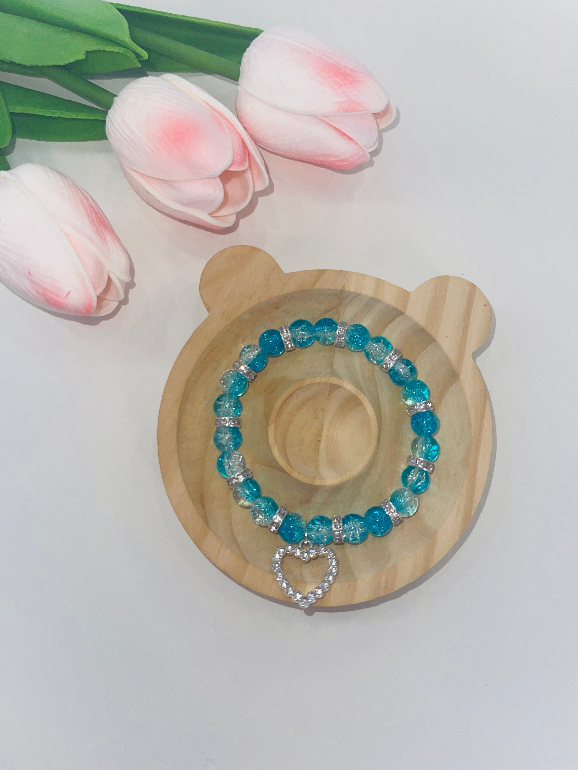 Dieses elegante Armband besteht aus schimmernden Crackle-Glasperlen in verschiedenen Türkistönen, die durch silberne Strass-Zwischenelemente stilvoll ergänzt werden. Highlight ist der glitzernde Herzanhänger, der dem Schmuckstück eine romantische Note verleiht. Das elastische Design sorgt für angenehmen Tragekomfort – perfekt für besondere Anlässe oder als liebevolles Geschenk.