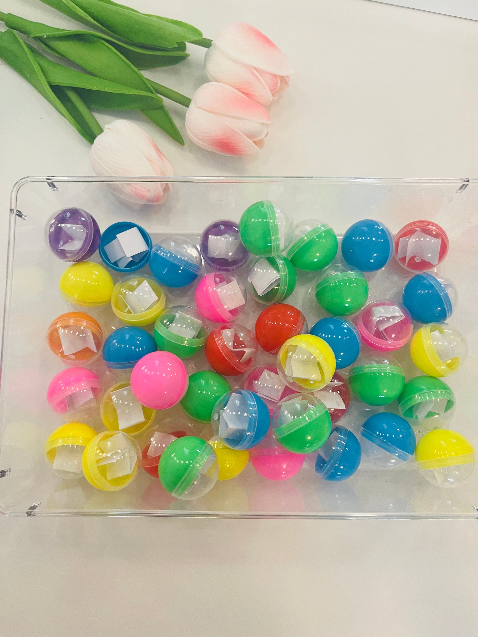 Die Mystery Schmuck Kugeln sind farbenfrohe Überraschungskapseln, die ein geheimnisvolles Schmuckstück enthalten. Jede Kapsel besteht aus einer transparenten Hälfte und einer farbigen Hälfte in leuchtenden Farben wie Blau, Grün, Gelb, Pink, Lila und Rot. Im Inneren befindet sich ein sorgfältig gefalteter Zettel, der möglicherweise Informationen über den enthaltenen Schmuck preisgibt.