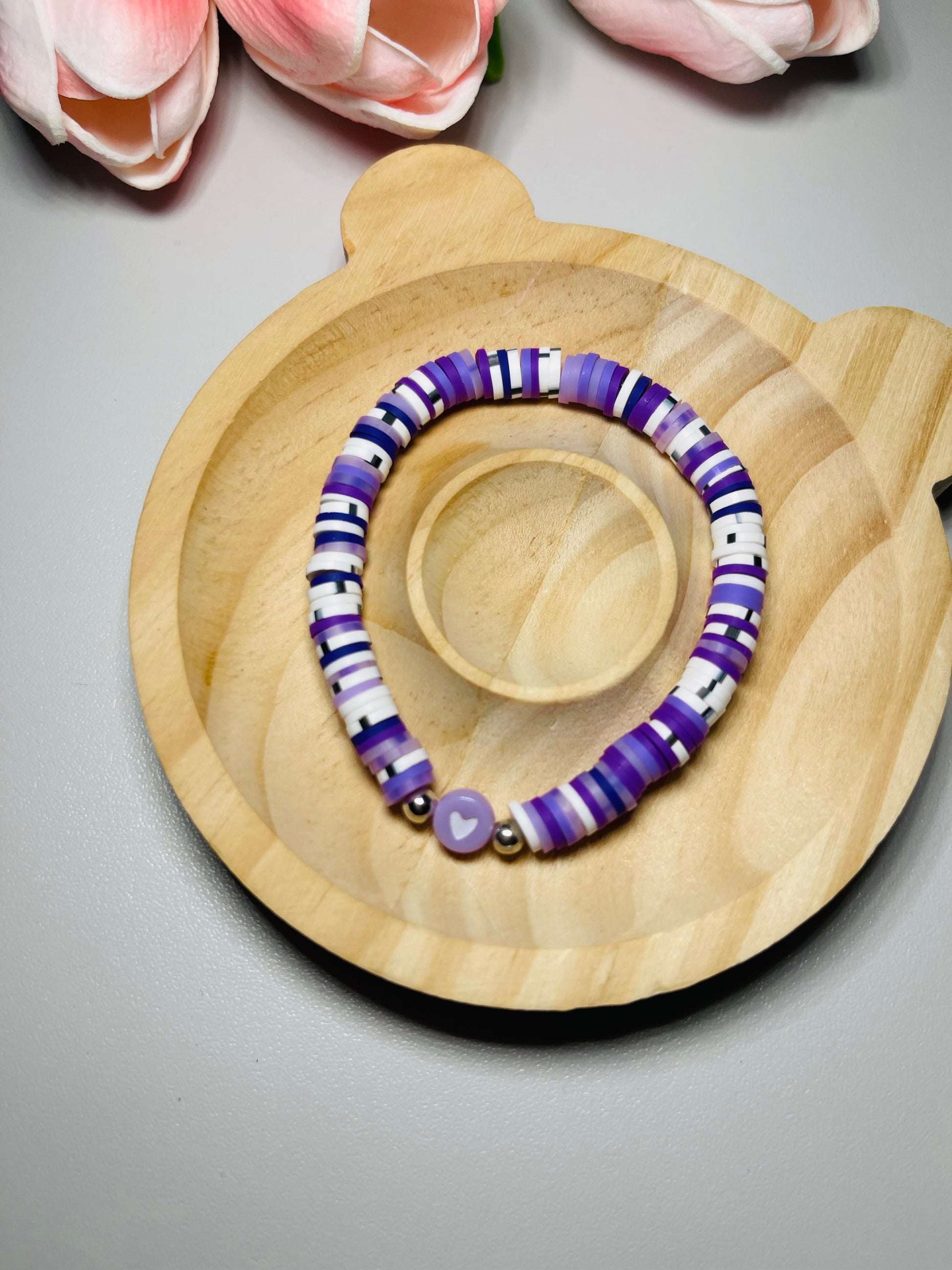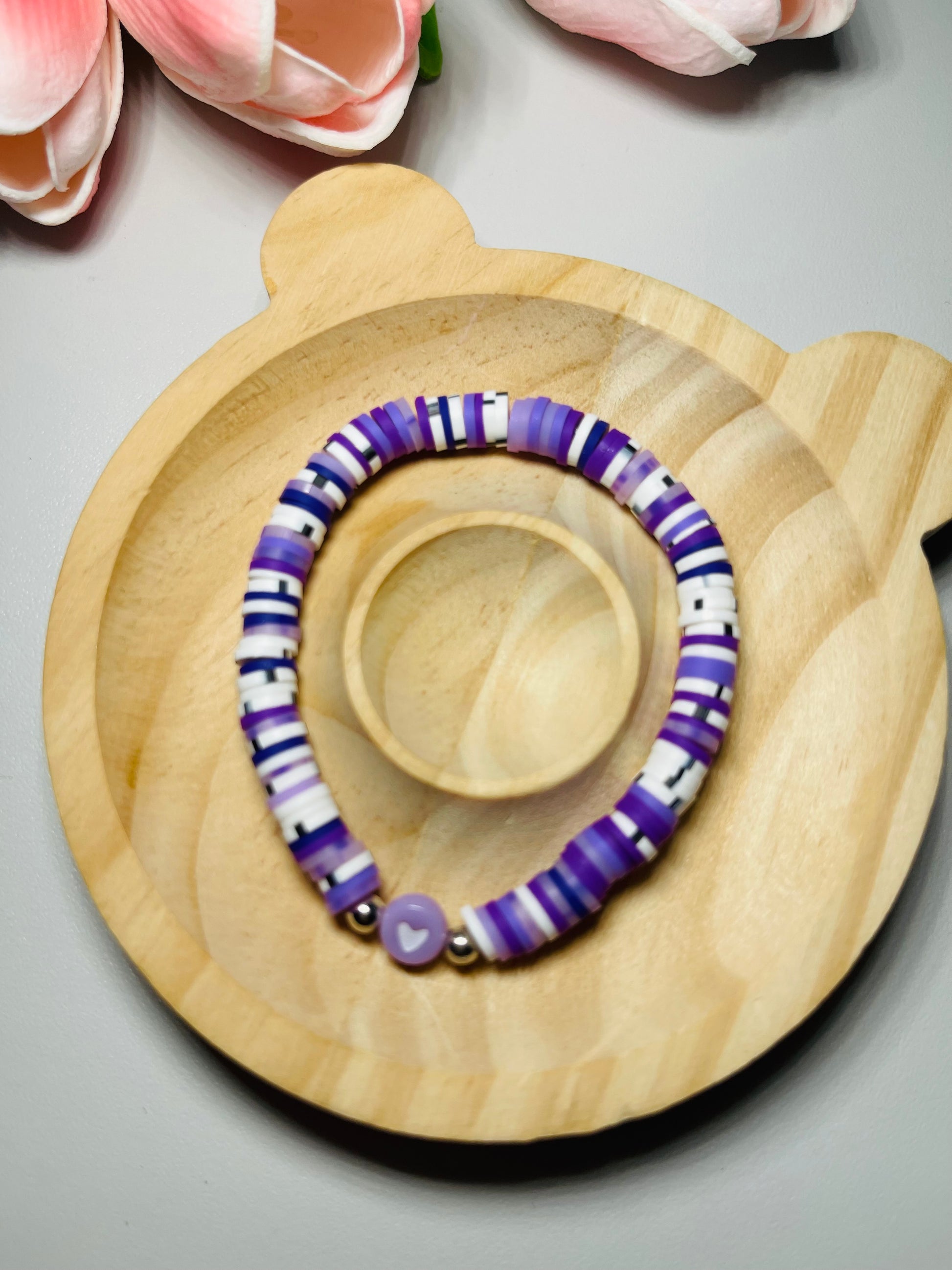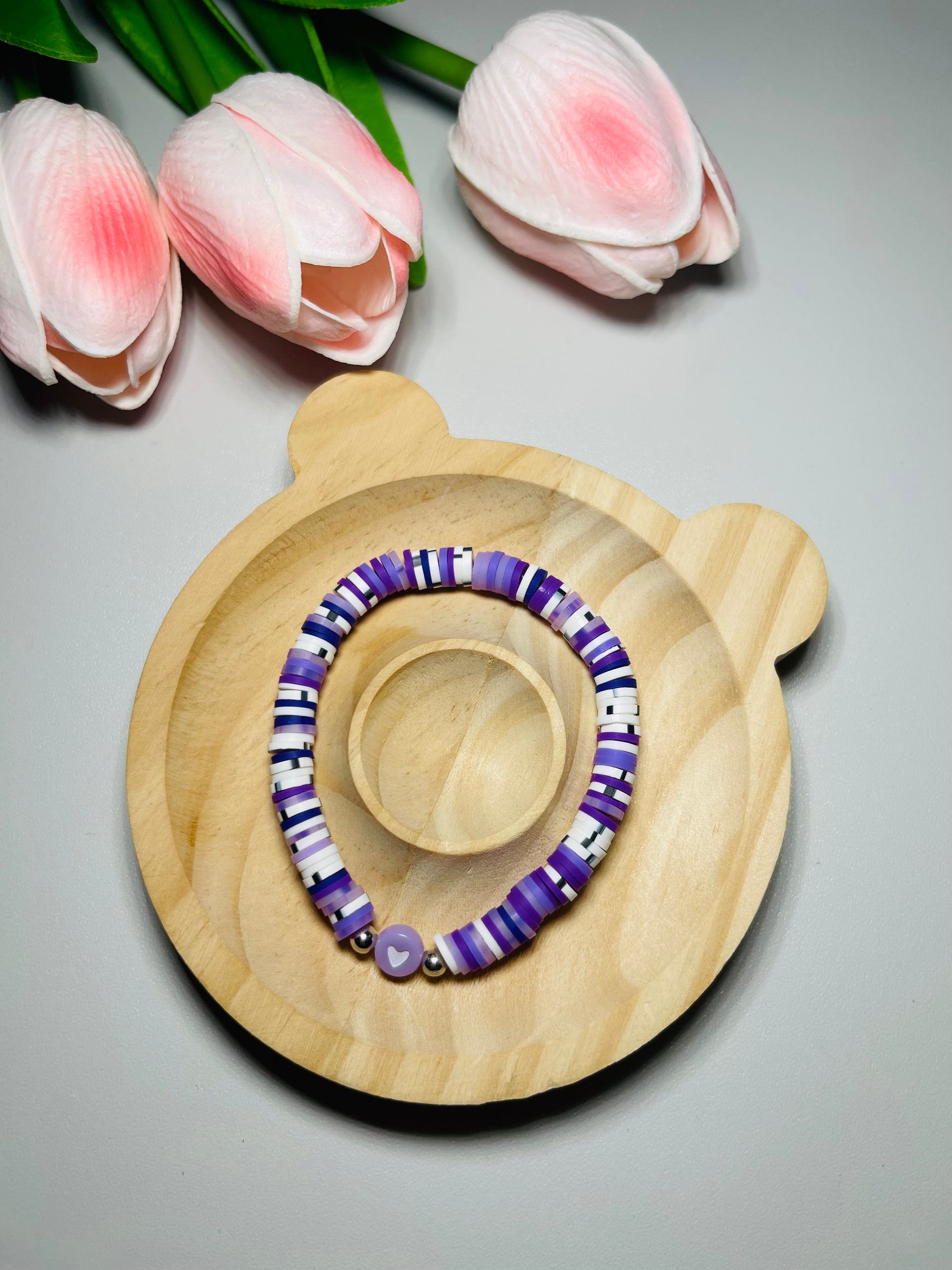 Dieses wunderschöne Clay Bead Armband besticht durch seine trendige Farbgebung in Lila, Weiß und Schwarz. Die flachen Perlen aus weichem Polymer-Ton sorgen für einen angenehmen Tragekomfort und verleihen dem Schmuckstück eine moderne, verspielte Optik.
