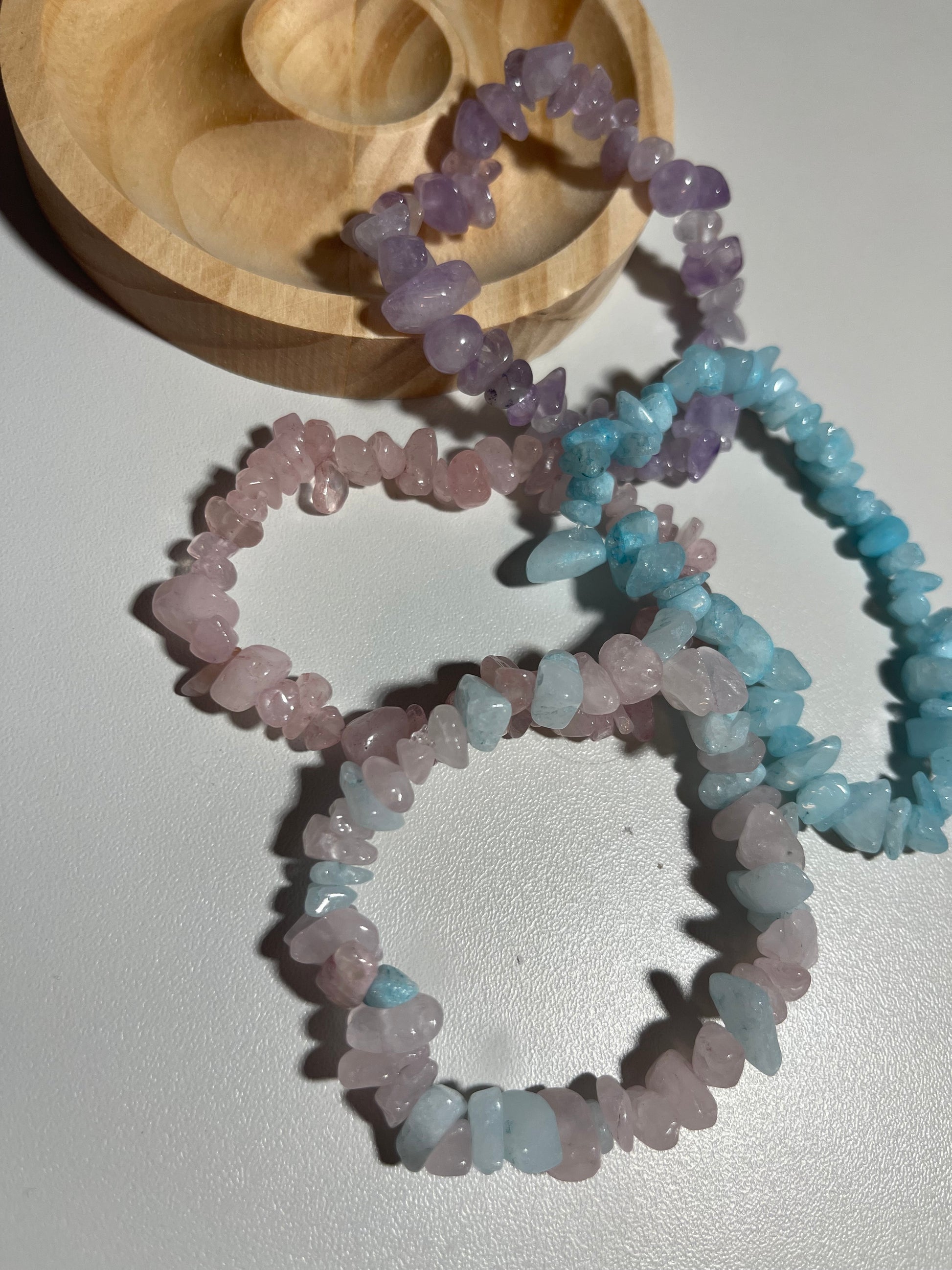 Diese handgefertigten Armbänder bestehen aus echten Quarz-Edelsteinen in sanften Pastelltönen. Zu sehen sind zartrosafarbener Rosenquarz, himmelblauer Aquamarin und violetter Amethyst – jeder Stein sorgfältig geschliffen und auf ein elastisches Band aufgezogen. Die natürlichen Quarze bringen nicht nur ihre einzigartigen Farben zur Geltung, sondern symbolisieren auch innere Ruhe, Harmonie und Klarheit. Perfekt als stilvolles Accessoire oder als energetisches Schmuckstück für den Alltag.